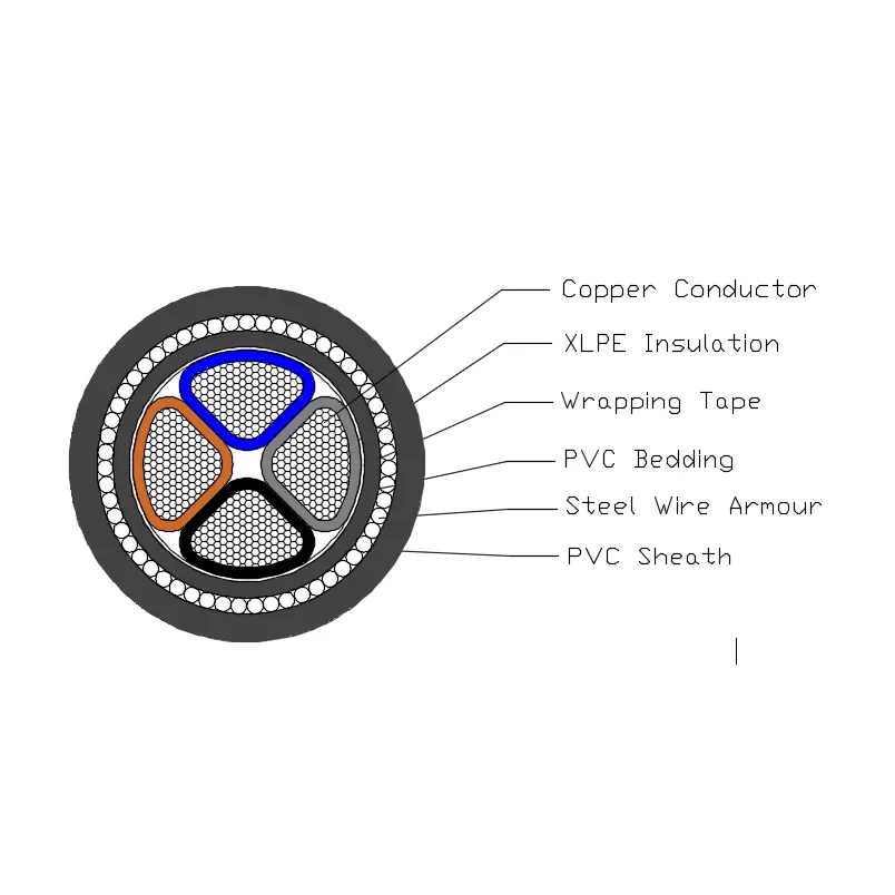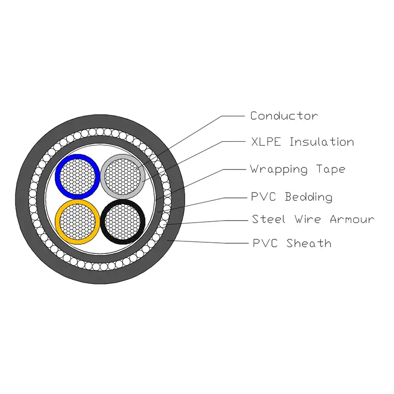 XLPE-isolert PVC-belagt SWA-strømkabel er sammensatt av en T1R kobberleder, XLPE-isolasjon, PVC-sengetøy, rustning av stål og PVC-kappe.